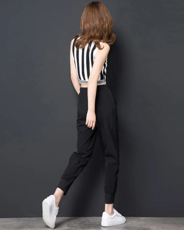 Crafted from premium, breathable fabric, they feature a stretchy elastic waistband with an adjustable drawstring for a personalized fit. The capri-inspired tapered legs offer freedom of movement, while still keeping your look sleek and trendy. Pair them with sneakers and a hoodie for casual streetwear, or style them with a crop top for a sporty chic outfit.