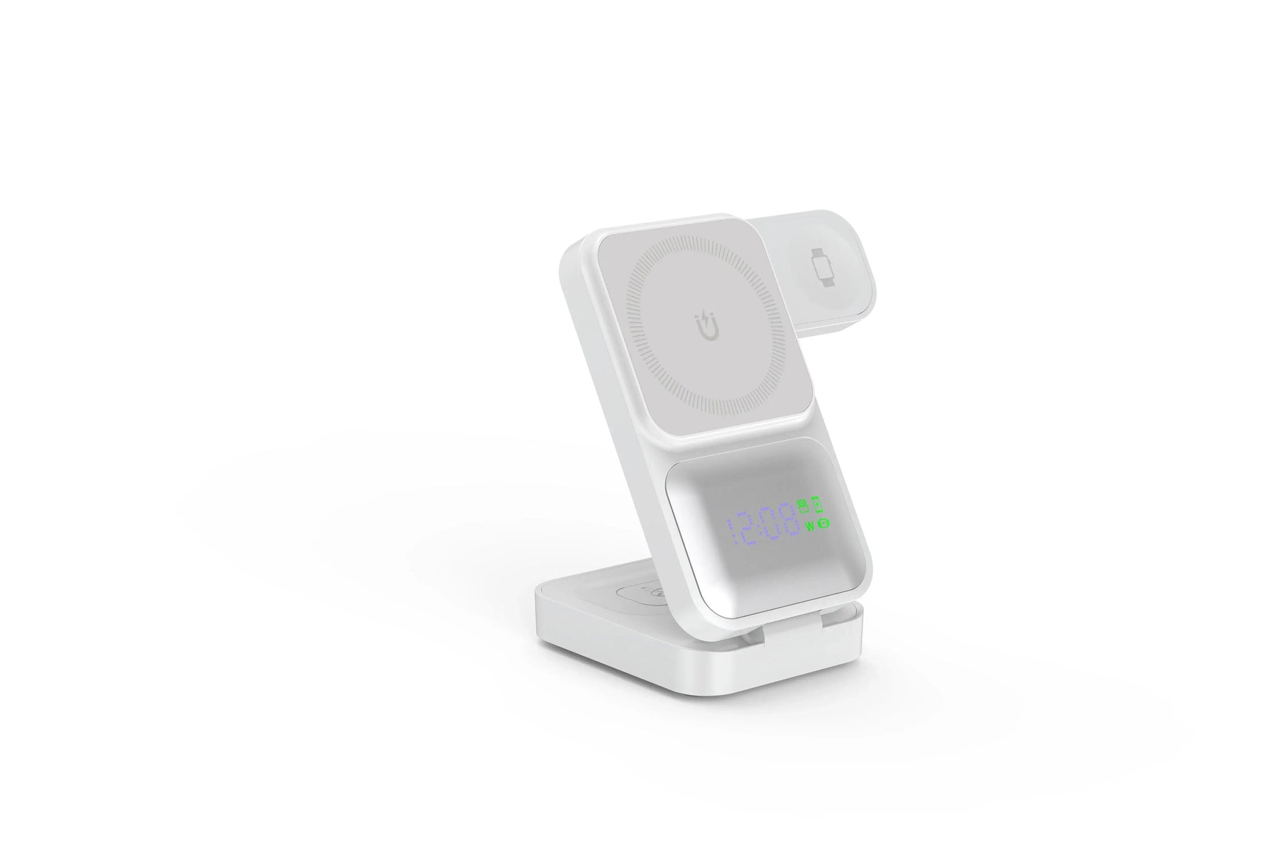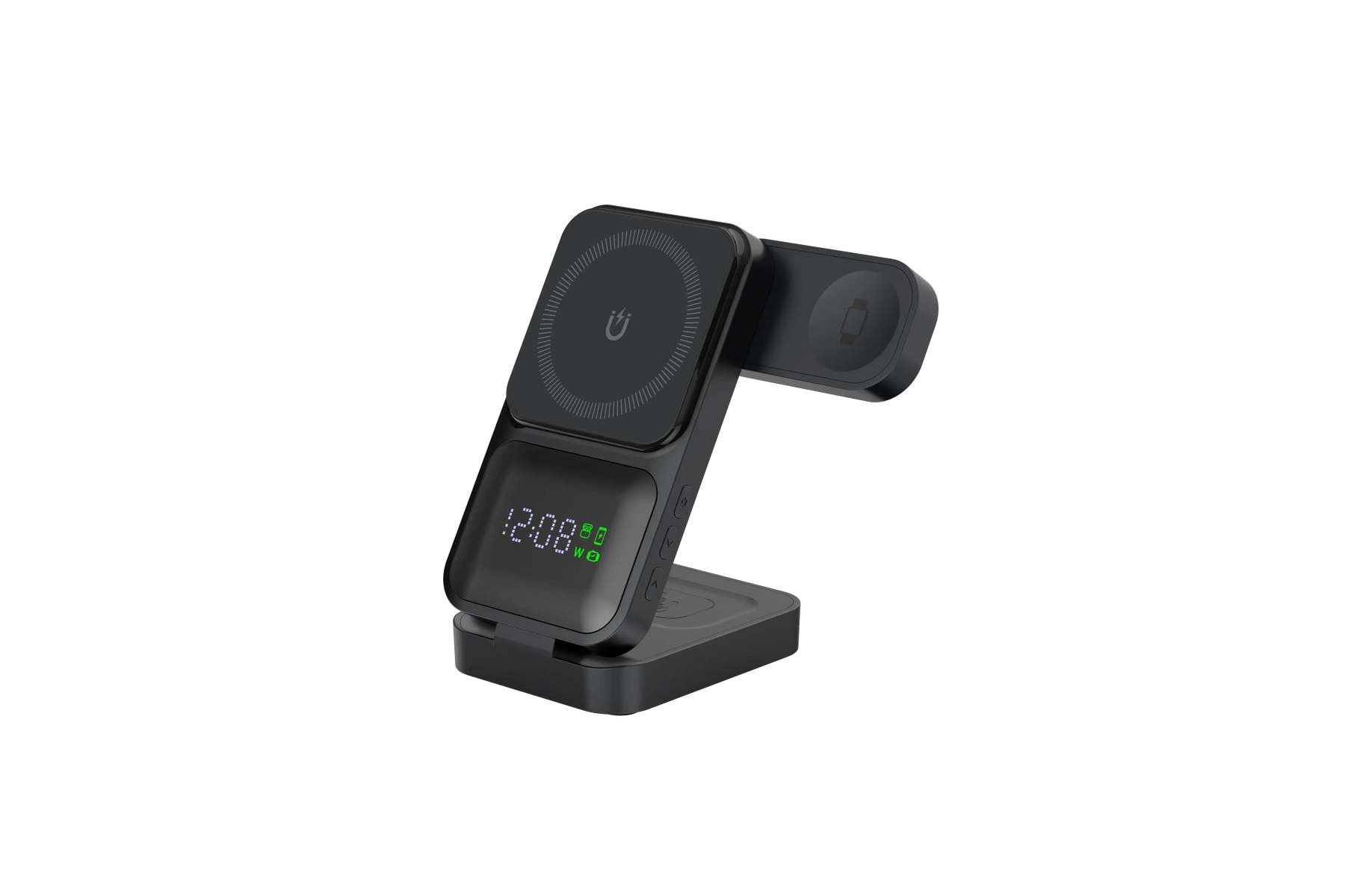 The 3-in-1 foldable design makes it compact and travel-friendly, allowing you to charge multiple devices without clutter. Its magnetic alignment ensures a secure and efficient charge every time, while the built-in digital clock and power display add extra functionality, making it more than just a charger.